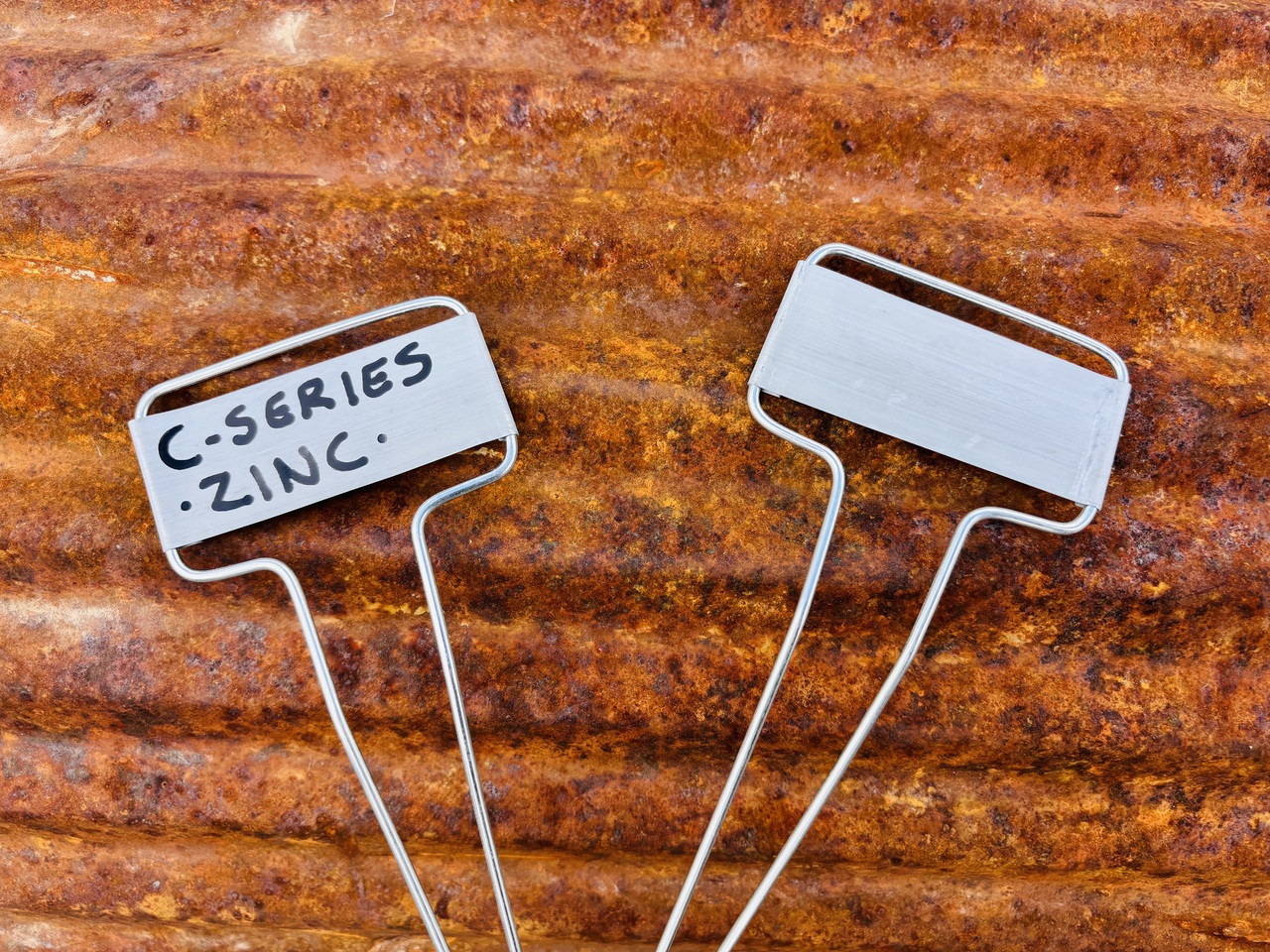 This sleek design offers a wide writable face plate with an angle for ideal visibility. C Series metal garden markers are durable and reusable. It comes in three different height options to fit wherever you would like to place it. The brushed finish on the plate even helps prevent a glare from the sun when strolling through the garden to make for easy readability. With these C Series Zinc garden markers, you will enjoy an organized, well-labeled garden. These markers also come preassembled for a quick and simple application.
