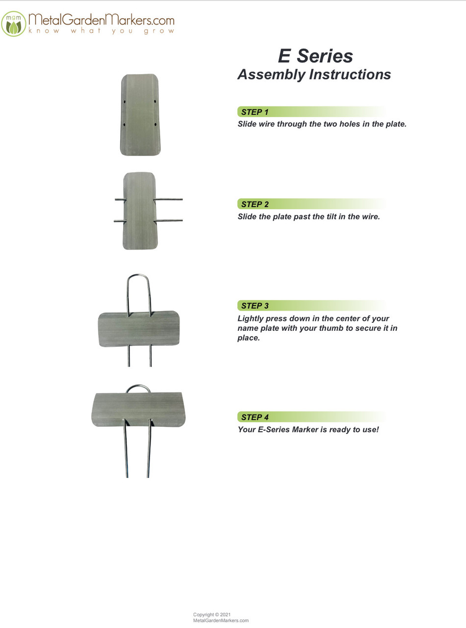 They arrive unassembled with reusable face plates for easy writing. Choose from multiple lengths to fit your plant height and gardening needs. Some assembly required: These markers are shipped unassembled to prevent damage and simplify the initial marking process. This label is easily assembled by sliding the nameplate up the double wire standard just past the bend and pressing gently on the center of the nameplate to secure in place. MetalGardenMarkers.com